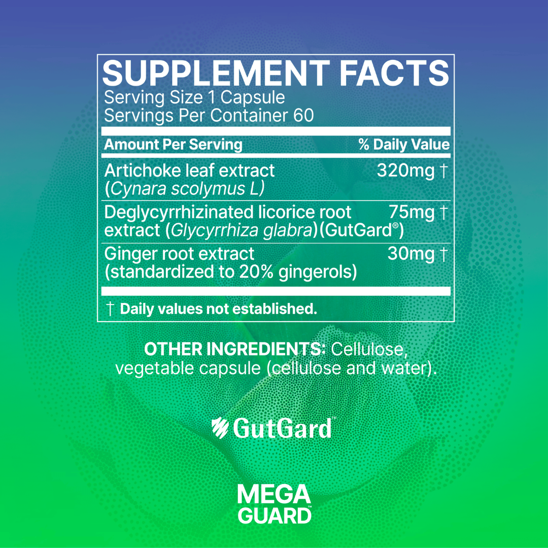 MegaGuard™ is a novel digestive aid that combines licorice polyphenols, cleansing artichoke leaf extract, and soothing ginger to promote normal digestion, regulate stomach acid, maintain healthy H. pylori levels, and reduce occasional digestive discomforts such as gas and bloating. With the power of these herbs combined, MegaGuard™️ provides unique and comprehensive digestive support, bowel regularity, and gastric balance.