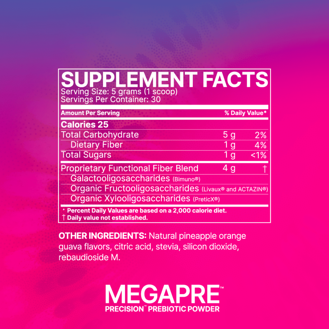MegaPre™ is the first Precision Prebiotic™ supplement made up of clinically tested, non-digestible oligosaccharides that can increase microbial diversity and selectively feed beneficial bacteria like Akkermansia muciniphila, Faecalibacterium prausnitzii, and Bifidobacteria. MegaPre™ REINFORCES the beneficial microbial changes created by MegaSporeBiotic™ to promote a strong and diverse microbiome.