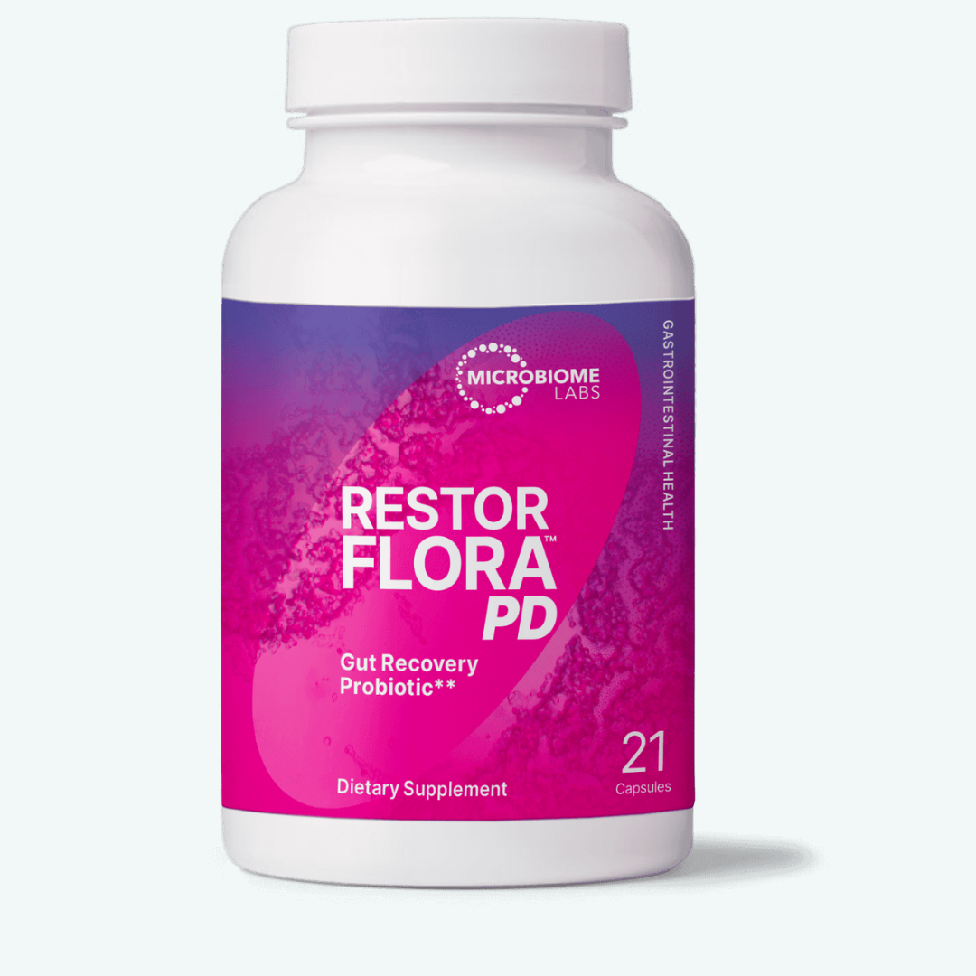 RestorFlora™ PD is a gut recovery probiotic that may help patients maintain a healthy gut microbial composition during and after taking microbial disrupting medications. RestorFlora™ PD contains probiotics that maintain potency in the presence of certain medications that may disrupt the microbial enviornment, while simultaneously supporting functional wellness.